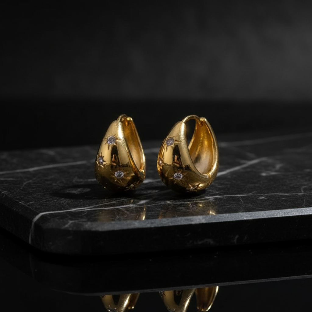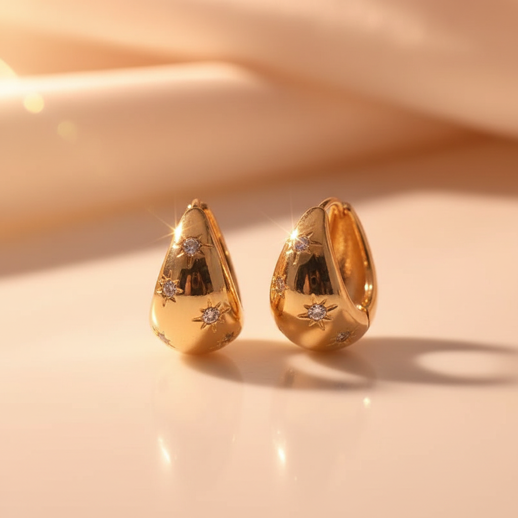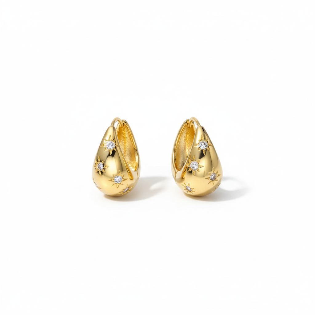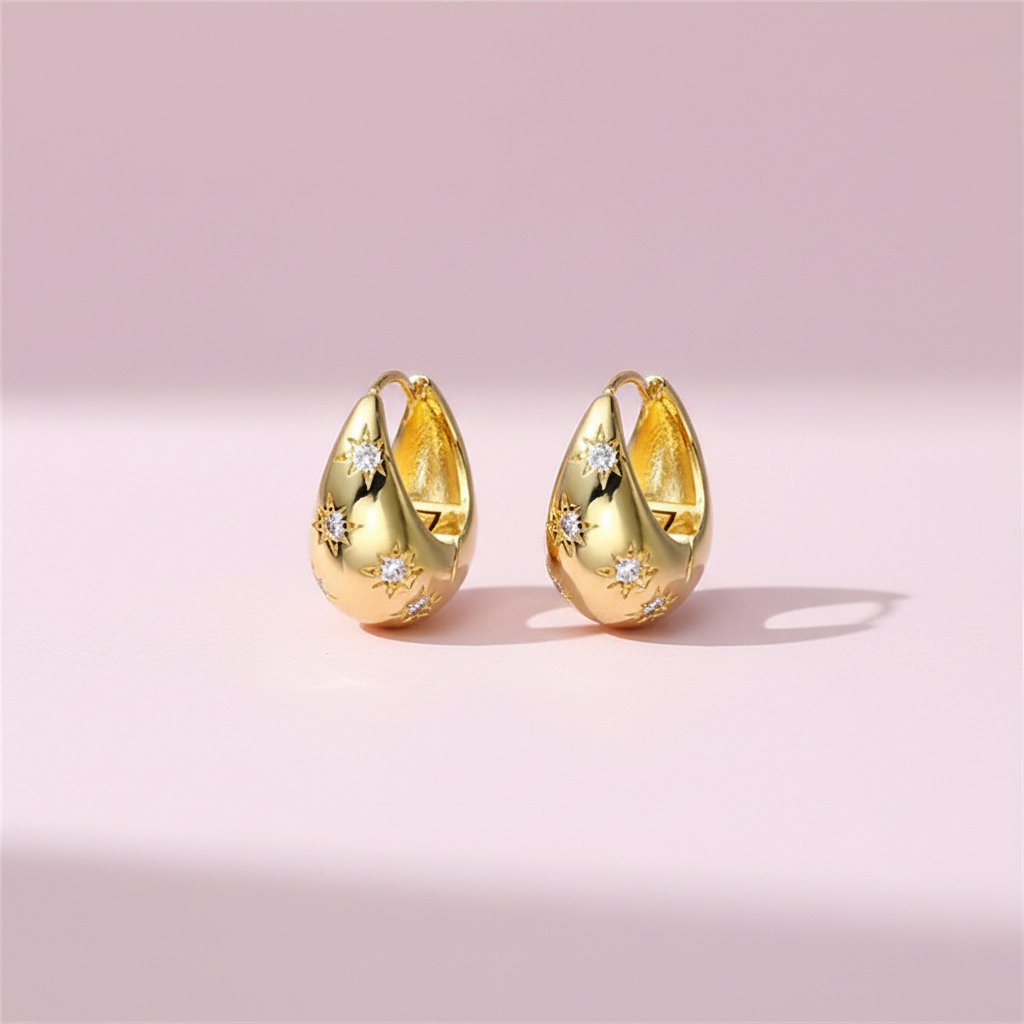 Elevate your look with these on-trend, chunky gold dome-shaped ear-hugging hoop earrings, with star engravement details and sparkling stones.